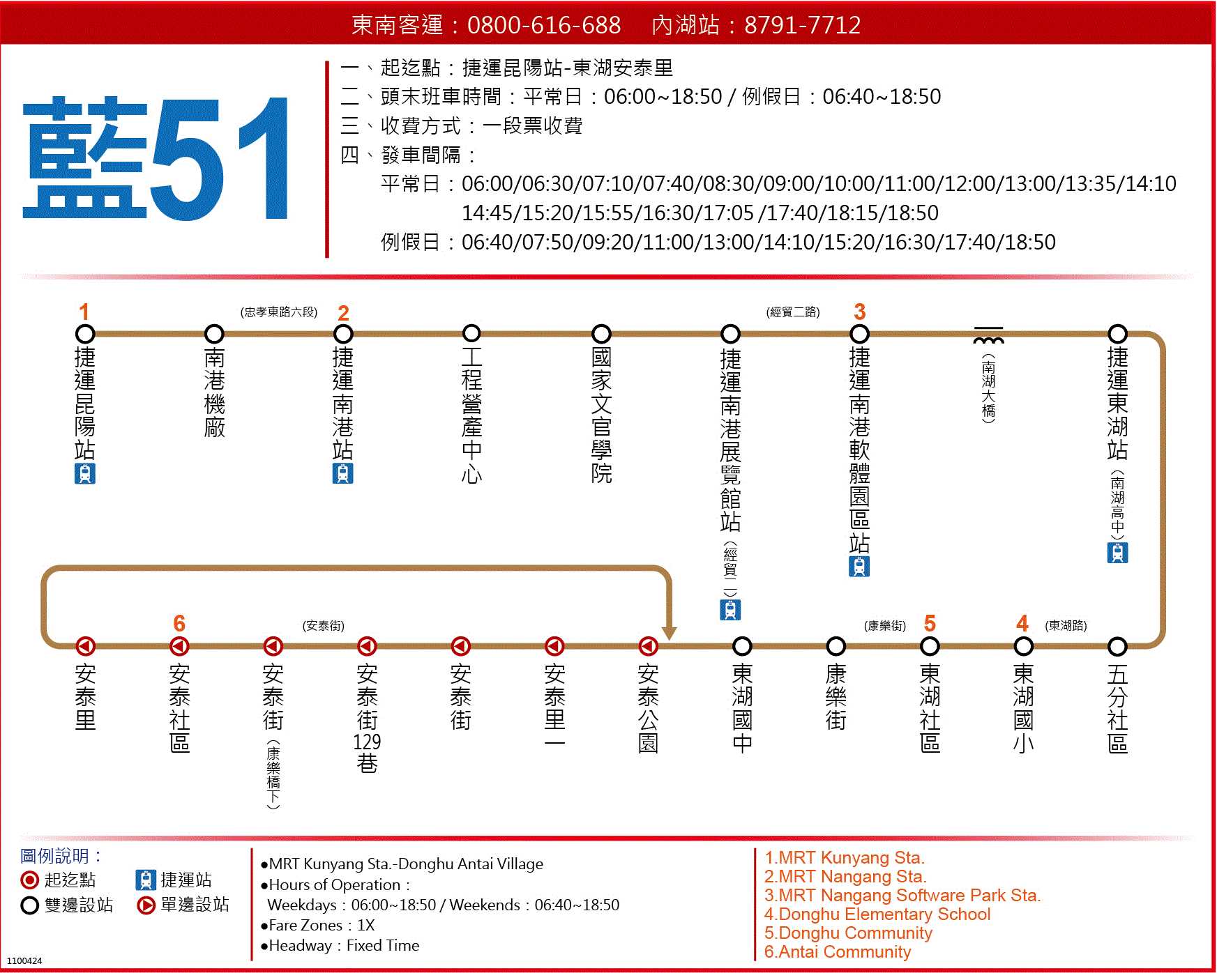 公車 2022-01-31 17:35:00 0 藍51號 起訖站名:捷運昆陽站 - 東湖安泰里 •頭末班車 平日:0600~1850 假日: 0640~1850•發車間距平日班表:0600 0630 0710 0740 0830 0900 1000 1100 1200 1300 1335 1410 1445 1520 1555 1630 1705 1740 1815 1850假日班表:0640 0750 0920 1100 1300 1410 1520 1630 1740 1850